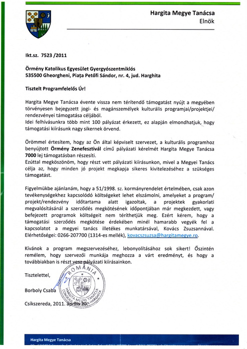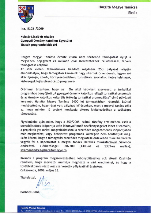 Örmény katolikus kulturális örökségünk népszerűsítésének támogatója Hargita Megye Tanácsa.